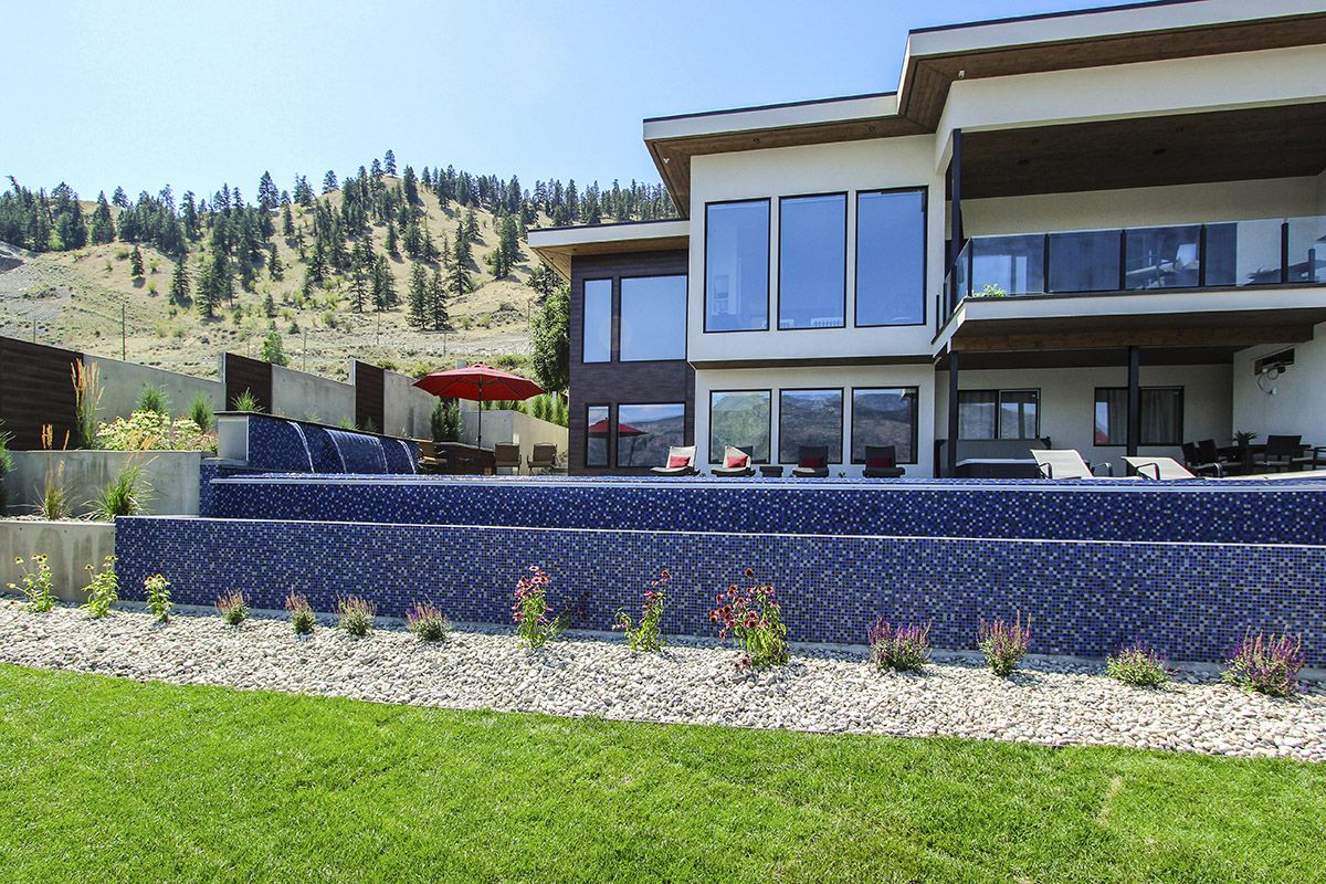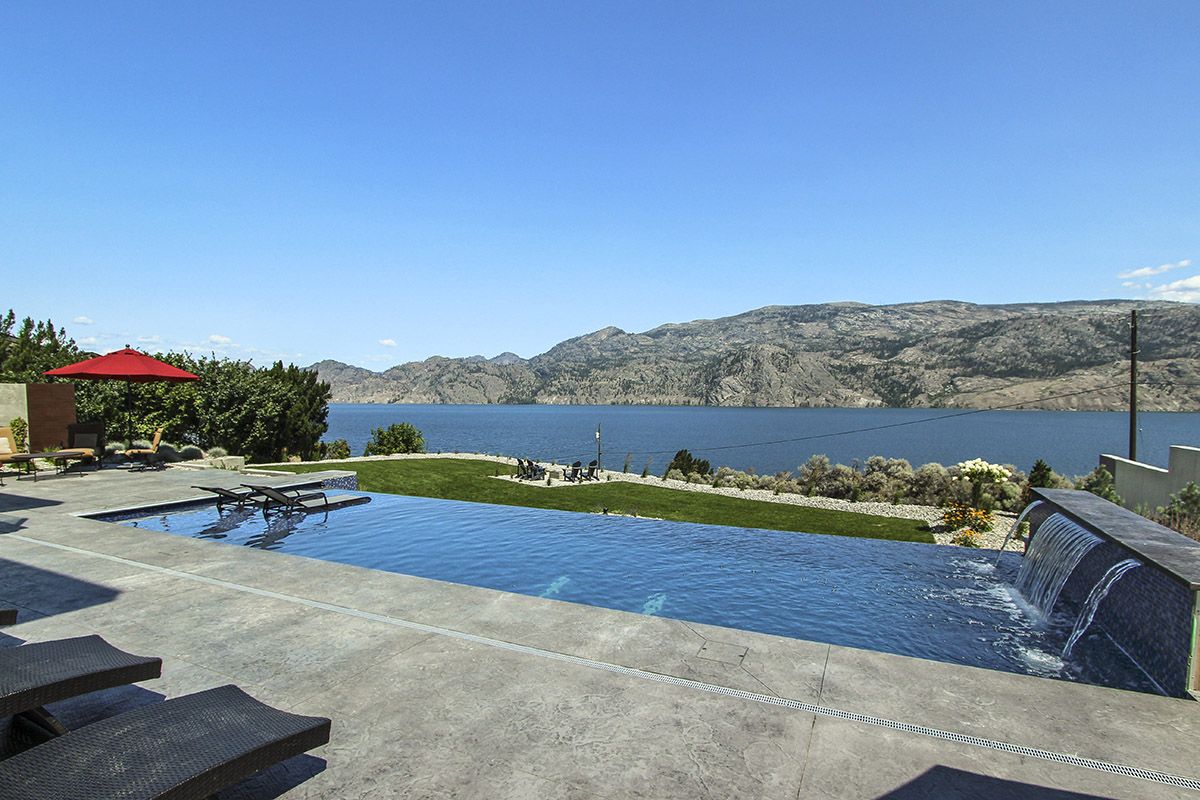 The expansive pool deck, tiled infinity edge pool with shallow Baha ledge, private hot tub, open greenspace and groomed landscape all overlook the lake taking advantage of the Okanagan warmth and sunshine.