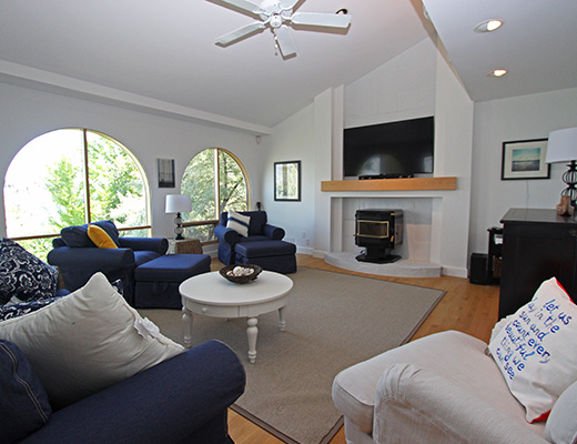 Inside guests enjoy hardwood flooring, vault-ceilings and a propane fireplace in the living room. The kitchen features jenn-air appliances and a center island with corian countertops. Enjoy your morning coffee on the cobblestone patio overlooking the lake through the grapevines. Wander down to your private dock for a dip in the lake and finish your day with dinner on your deck with the sounds of the wilderness around you.